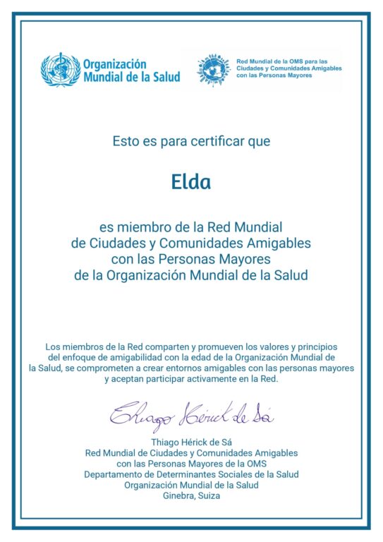 El Ayuntamiento de Elda ha recibido el certificado de la Organización Mundial de la Salud (OMS) que acredita su pertenencia a la Red Mundial de Ciudades y Comunidades Amigables con las Personas Mayores. El certificado, firmado por Thiago Hérick de Sá, responsable técnico del Departamento de Determinantes Sociales de la Salud de la OMS, indica que «los miembros de la Red comparten y promueven los valores y principios del enfoque de amigabilidad con la edad de la OMS se comprometen a crear entornos amigables con las personas mayores y aceptan participar activamente en la Red».