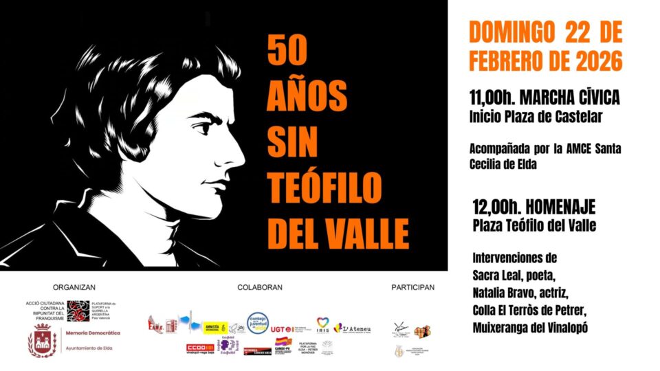 Por su parte, Manuel de Juan ha explicado que se ha elaborado un manifiesto bajo el lema ‘50 años sin Teófilo del Valle’, que ha recibido el respaldo de numerosas asociaciones vecinales, sindicales, culturales, juveniles y cristianas de Elda y Petrer, así como de colectivos memorialistas de toda la Comunidad Valenciana.