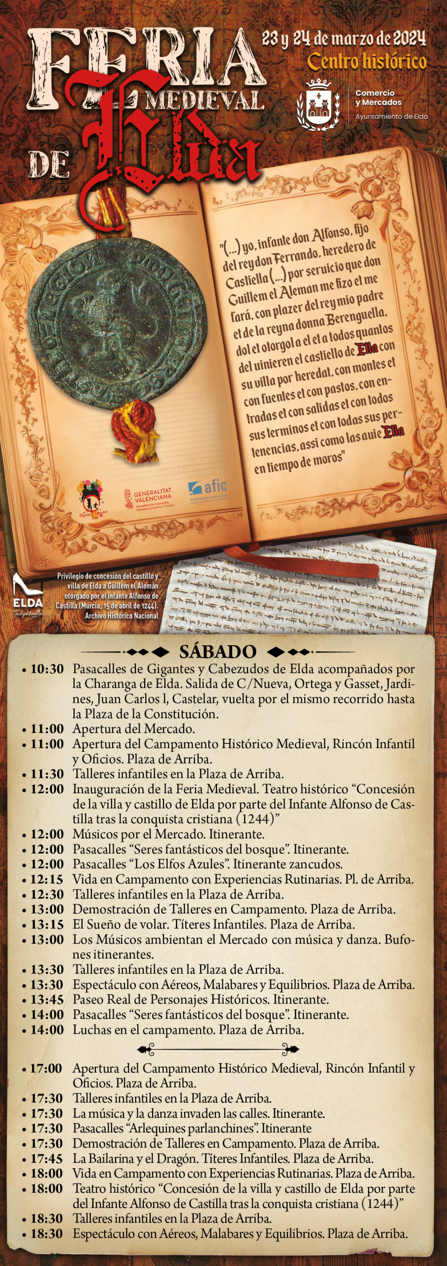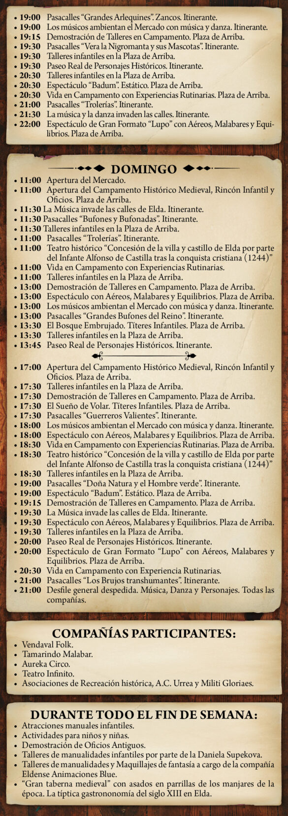 Silvia Ibáñez ha indicado que «recreamos un episodio histórico muy importante para nuestra ciudad, como es la concesión de la villa y castillo de Elda por parte del Infante de Castilla tras la conquista cristiana. La feria contará con un gran número de actividades con el objetivo de ofrecer una propuesta cultural y de animación muy amplia tanto a los vecinos y vecinas de Elda como a los visitantes que se acerquen de otras localidades».
