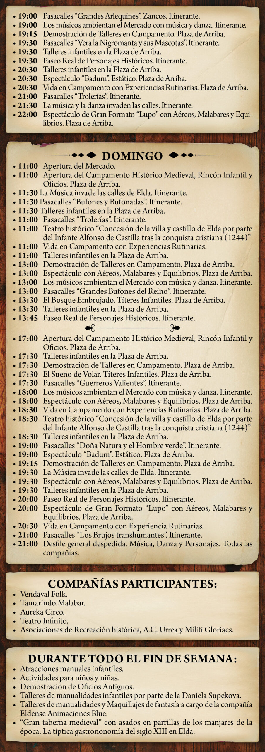La Feria Medieval de Elda cuenta con las siguientes compañías teatrales y de espectáculos: Vendaval (compañía de música y danzas), Teatro Infinito (compañía de personajes y teatro infantil), Tamarindo Malabar (circo, personajes, equilibrios y espectáculo aéreo) y Asociación Cultural Caballeros y Damas de Urrea (especialistas en recreación histórica).