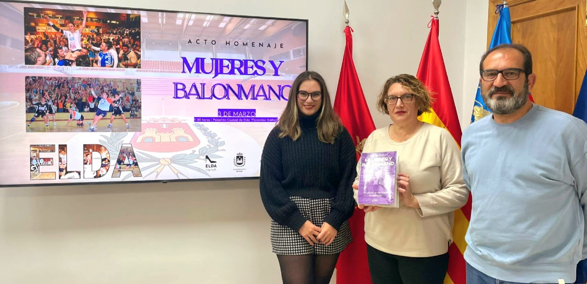 La concejala de Deportes, María Gisbert, y el edil de Igualdad y Mujer, David Guardiola, junto a Loli Martínez, capitana de las veteranas del CBF Elda Prestigio, ha presentado el acto homenaje ‘Mujeres y Balonmano’, una actividad que se realizará el próximo sábado, 3 de marzo a partir de las 11.30 horas en el Pabellón Ciudad de Elda-Florentino Ibáñez, y que se enmarca en el programa organizado por el Ayuntamiento de Elda con motivo de la celebración del Día Internacional de la Mujer.