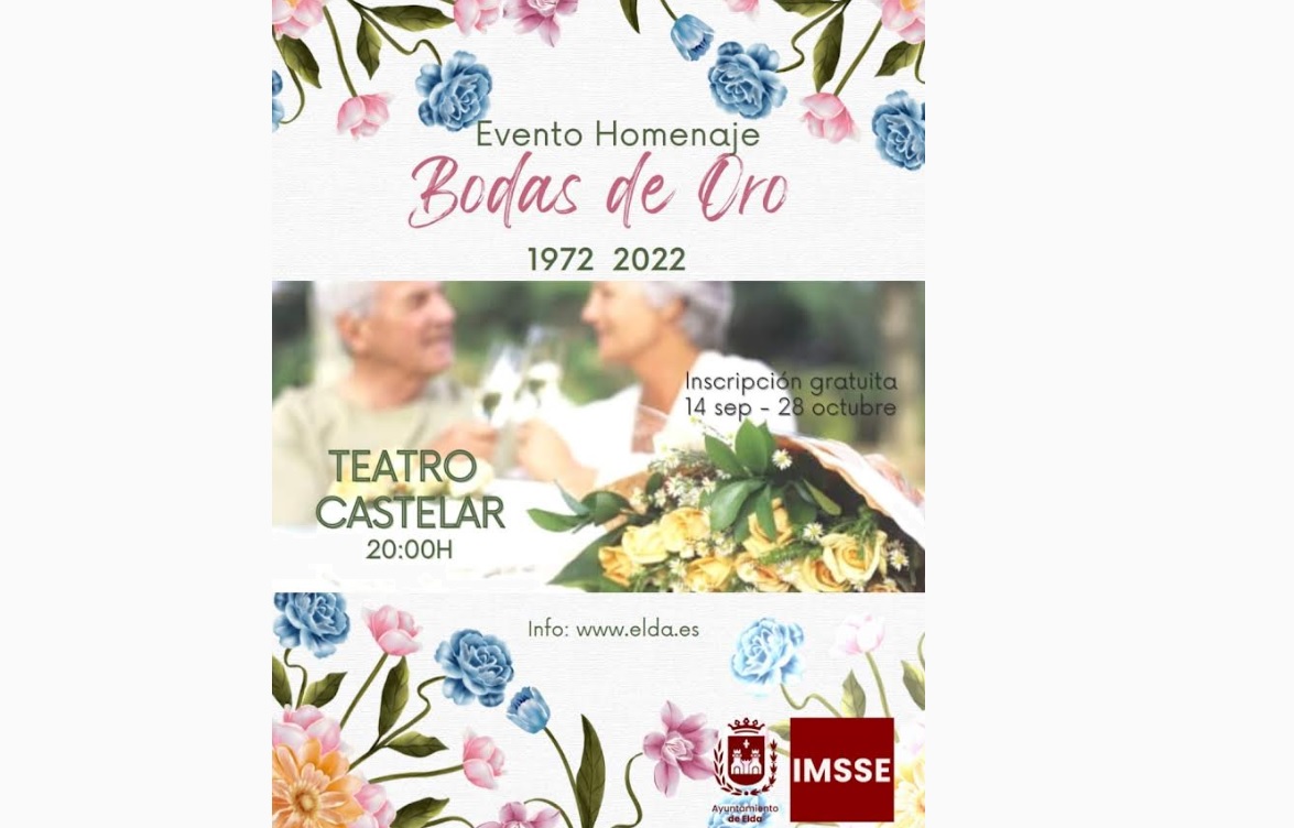 10 de noviembre de 2022.- El Ayuntamiento de Elda organiza una nueva edición de las ‘Bodas de Oro’ mañana viernes, 11 de noviembre, a las 20:00 horas en el Teatro Castelar con el objetivo de rendir homenaje a los matrimonios eldenses que celebran 50 años de casados.