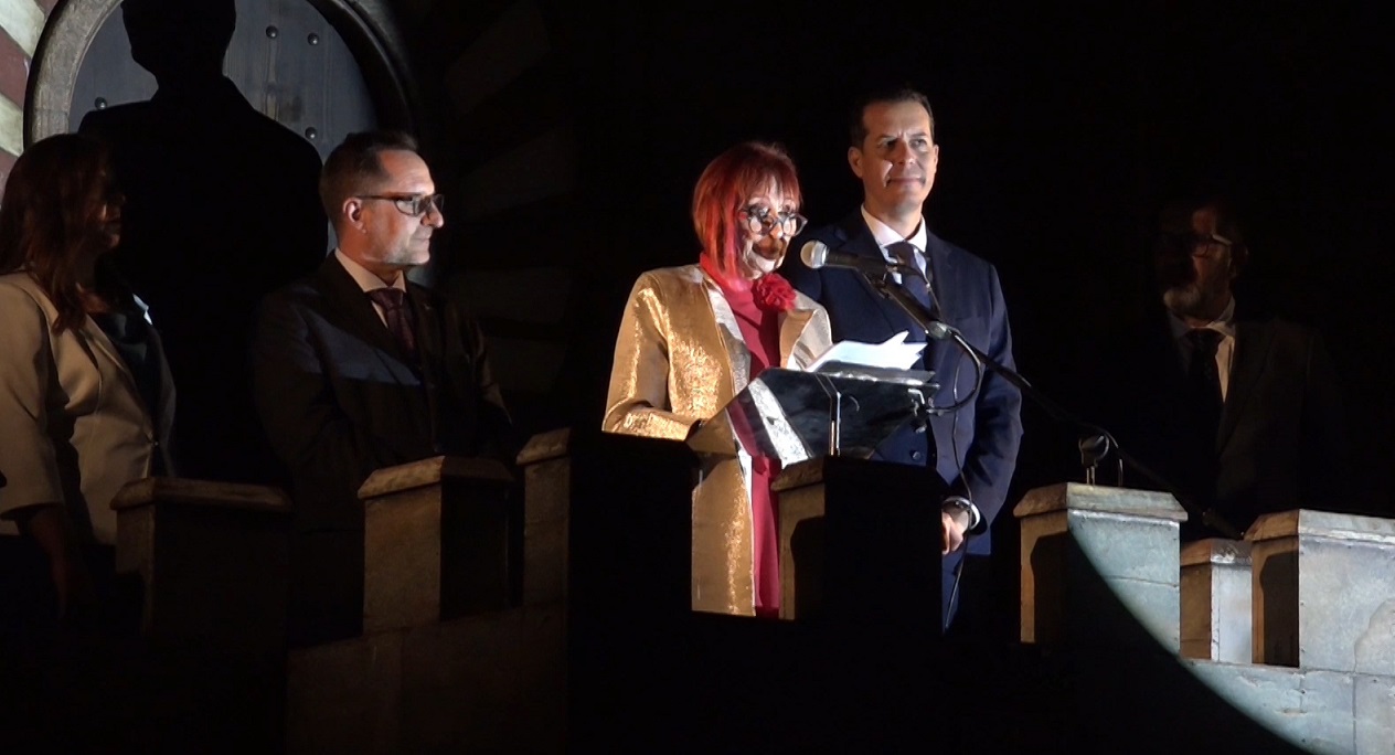 La escritora eldense Elia Barceló ha sido la encargada de dar la bienvenida a la Fiesta eldense desde el Castillo de Embajadas de la Plaza de la Constitución en este miércoles, 12 de junio de 2024.