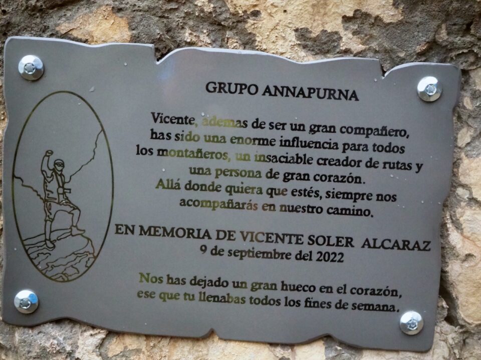 Colocaron una placa conmemorativa con el siguiente texto: “Vicente, además de ser un gran compañero, has sido una gran influencia para todos los montañeros, un insaciable creador de rutas y una persona de gran corazón. Allí donde quiera que estés, siempre nos acompañarás en nuestro camino. Nos has dejado un gran hueco en el corazón, ese que tú llenabas todos los fines de semana”.
