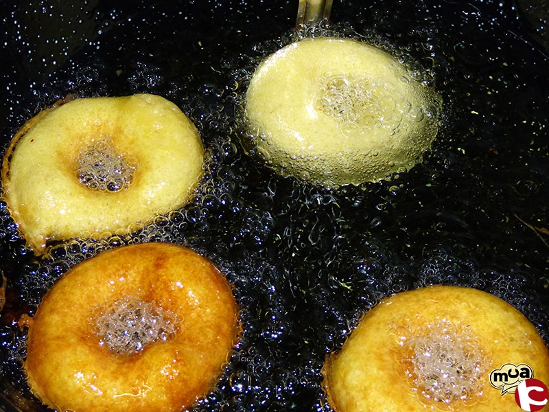 Freír en abundante aceite, este ha de estar muy caliente y la buñuelera también. Iremos rellenando la buñuelera, la sumergiremos en el aceite y dejaremos que el buñuelo se desprenda solo.