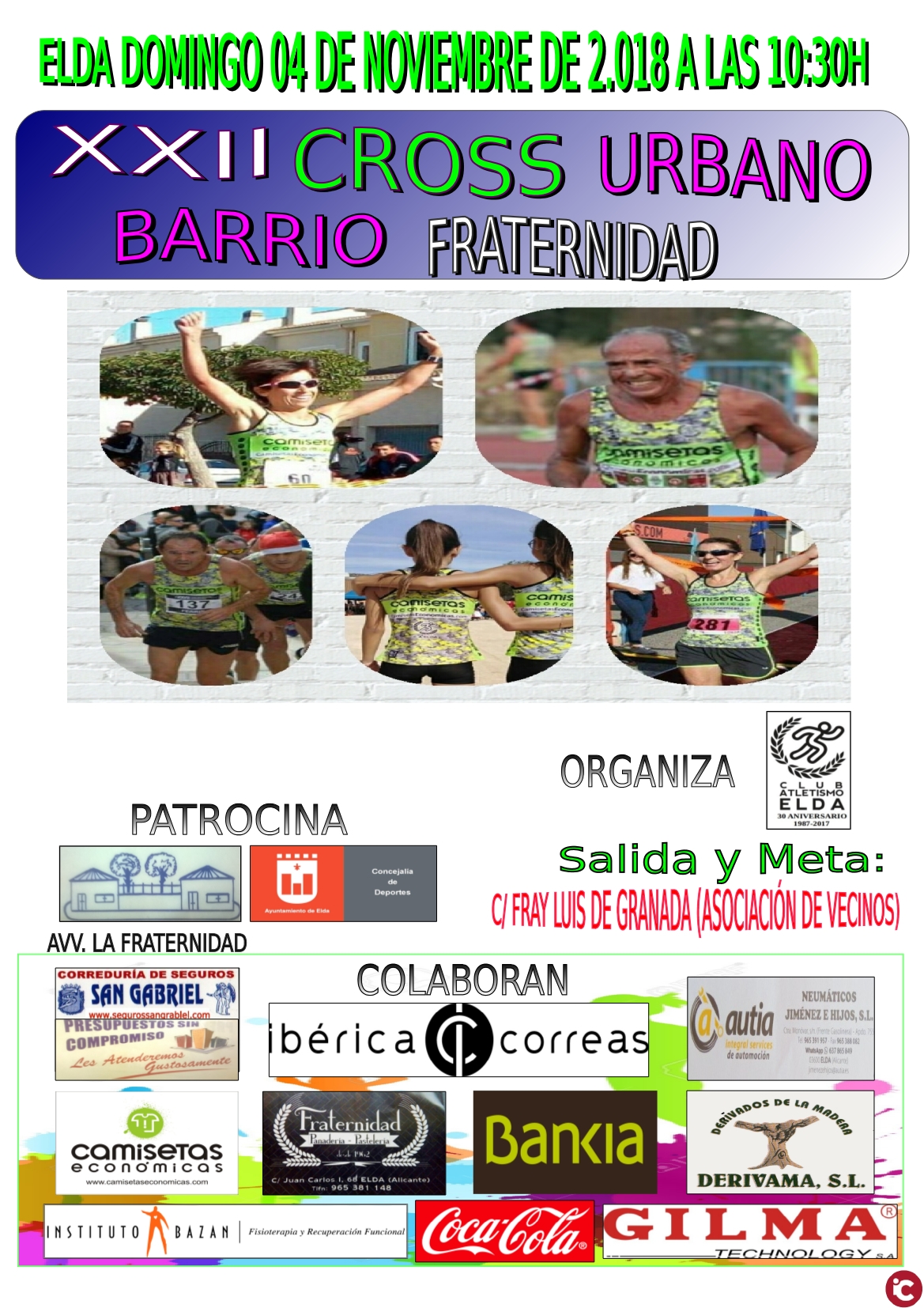 El XXII Cross Urbano Fraternidad, ya tienen las inscripciones abierta, para las categorías querubín, prebenjamín, benjamín, alevín e infantil las inscripciones se realizarán el mismo domingo 4 de noviembre, para las categorías cadete, senior y veteranos/as, se podrán inscribir por email: atletismoelda@hotmail.com o el mismo día la prueba.