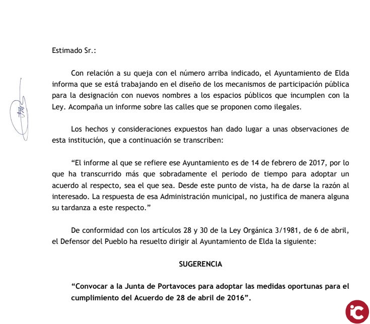 Este martes, 20 de noviembre, recibimos la contestación a la queja que registramos en el Defensor del Pueblo el pasado 4 de julio. Este escrito recogía nuestra demanda de desarrollar el acuerdo alcanzado en Pleno el 28 de abril de 2016 para la retirada de simbología franquista de la ciudad. Pero no fue un acuerdo cualquiera, fue uno de los pocos que ha salido por unanimidad en esta legislatura. Recordamos que la negociación no fue sencilla, pues tuvimos que poner de acuerdo a todas las sensibilidades políticas representadas en el Ayuntamiento. Y lo hicimos por una sencilla razón: sin memoria, no hay democracia.