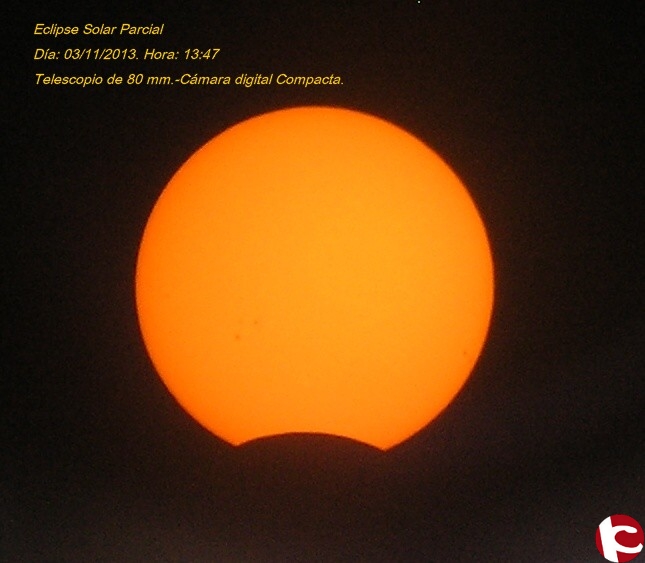 El domingo día 3 de noviembre, la Asociación de Amigos de la Astronomía de Elda, organizó en la terraza de la Fundación Paurides la observación del Eclipse Solar Parcial, que comenzó a las 13:06 h. y el máximo se produjo a las 13:46 h.