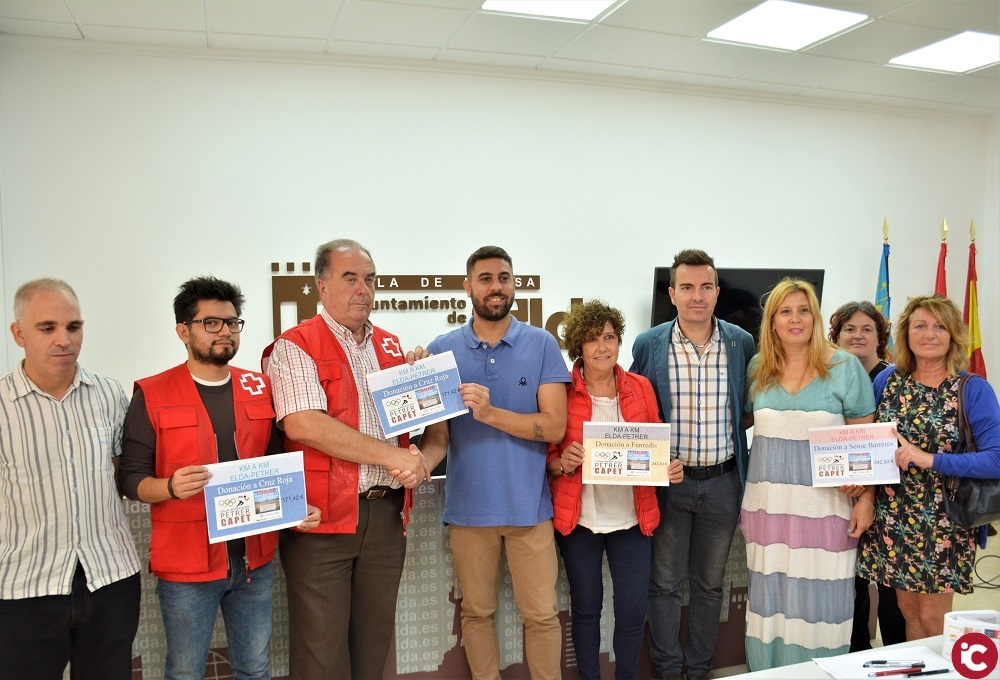 La carrera solidaria que recorrió las calles de Elda y Petrer el pasado 7 de julio fue todo un éxito de participación. En ese sentido, el Club Atletismo Capet, organizador de la prueba, ha hecho entrega esta mañana del dinero recaudado a la asociación eldense Funredis, a Sense Barreres de Petrer, así como a la Cruz Roja de ambas poblaciones.