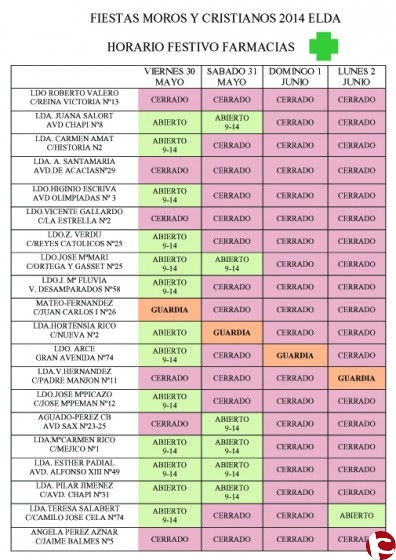 Desde www.elda.es nos han informado del listado dónde se puede consultar el horario de las farmacias durante los días de fiesta de Moros y Cristianos 2014 (30 y 31 de mayo y 1 y 2 de junio).