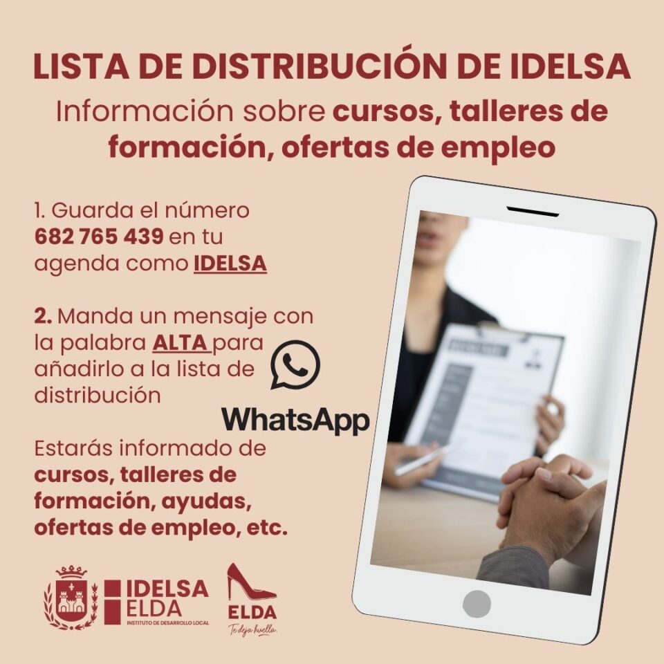 El Ayuntamiento de Elda, a través de la Concejalía de Fomento Económico, Industria y Empleo, ha puesto en marcha una lista de distribución de Whatsapp para enviar información del Instituto de Desarrollo Local de Elda (IDELSA) a todas aquellas personas interesadas.