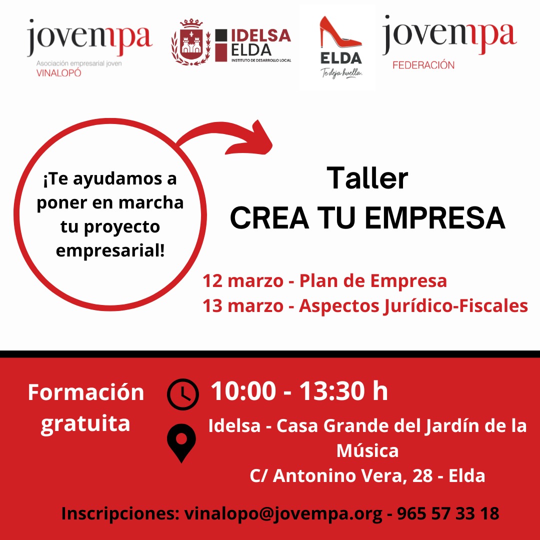 7 de marzo de 2024.- El próximo martes, 12 de marzo, dará comienzo una nueva edición del ciclo de talleres de formación ‘Crea tu empresa’, fruto del convenio entre el Instituto de Desarrollo de Elda (IDELSA), la Asociación de Jóvenes Empresarios de la Comarca del Medio Vinalopó y la Federación de Asociaciones de Jóvenes Empresarios de la Provincia de Alicante.