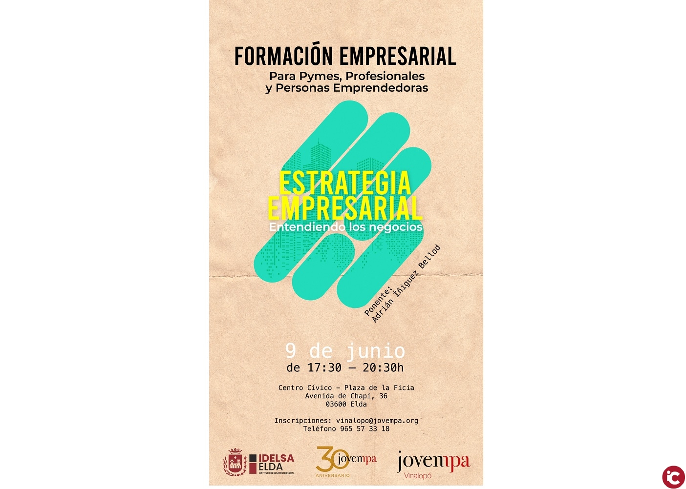 La formación, que tendrá lugar el miércoles 9 de junio en el Centro Cívico y Juvenil, se enmarca en el convenio de colaboración entre el Ayuntamiento de Elda y la Asociación de Jóvenes Empresarios