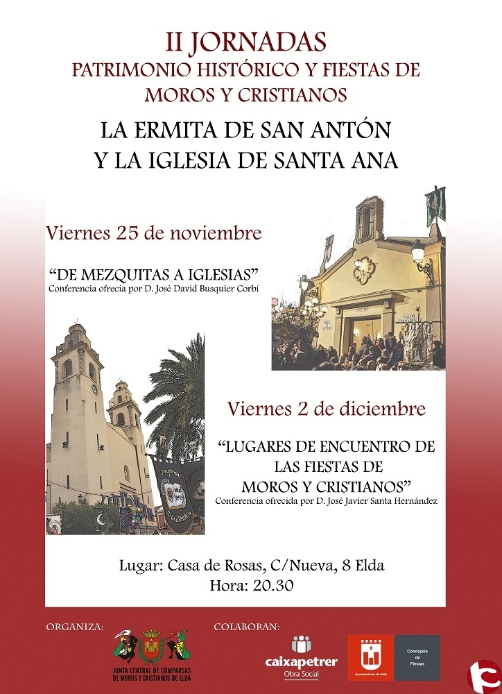 La Junta Central de Comparsas informaba que los próximos viernes 25 de noviembre y 2 de diciembre se van a celebrar las II Jornadas sobre Patrimonio histórico y Fiesta de Moros y Cristianos que este año versan sobre la Ermita de San Antón y la iglesia de Santa Ana.