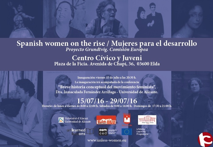 La Sede Universitaria de Elda tiene previsto inaugurar este viernes, día 15 de julio a las 20´30 h en el Centro Cívico y Juvenil de Elda la exposición Spanish women on the rise, vinculada al Proyecto Grundtvig que tenía como objetivo rescatar de la invisibilidad histórica a mujeres que fueron influyentes en la sociedad de los siglos XVIII al XX y que, a pesar de sus esfuerzos, no han recibido reconocimiento, no son recordadas ni han sido estudiadas. Recordar los esfuerzos y la influencia en la sociedad de las mujeres de cada país participante que no fueron «reconocidas» por la historia constituye el objetivo principal de esta iniciativa europea.