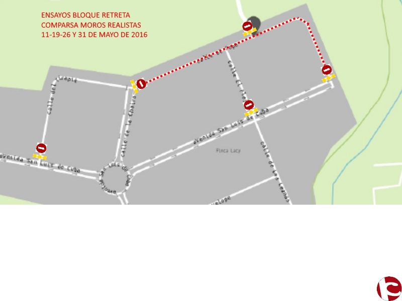 Sirva El presente al objeto de comunicarle el acto que consta (ENSAYOS BLOQUE RETRETA COMPARSA MOROS REALISTAS), que tendrá lugar los días 11, 19, 26 y 31 de MAYO del presente año, rogando tengan en cuenta el desarrollo del presente en aquellas cuestiones relativas al servicio que desarrollan, informándoles que en el plano constan aquellas calles que estarán cortadas al tráfico de 22:00 a 24:00 horas: