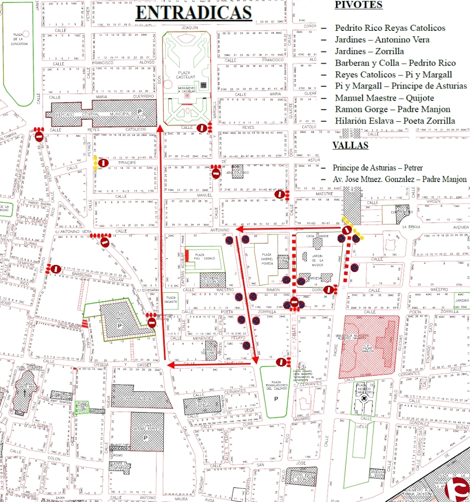 Sirva El presente al objeto de comunicarle el acto que consta (ENTRADICAS CRISTIANA Y MORA), que tendrá lugar los días 21 y 28 de MAYO del presente año, A LAS 23:00 HORAS rogando tengan en cuenta el desarrollo del presente en aquellas cuestiones relativas al servicio que desarrollan, informándoles que en el plano constan aquellas calles que, con cuatro horas de antelación al desarrollo del evento, estarán cortadas al tráfico: