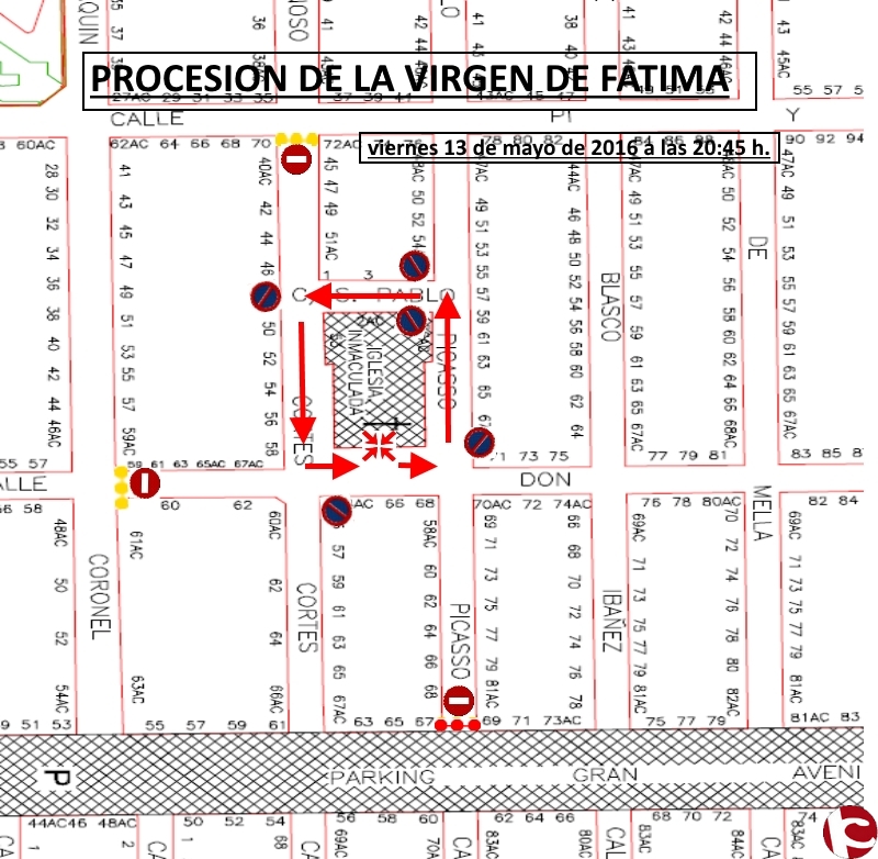 Sirva El presente al objeto de comunicarle el acto que consta, (PROCESION CON LA IMAGEN DE LA VIRGEN DE FATIMA EN LA PARROQUIA INMACULADA CONCEPCION) que tendrá lugar el VIERNES día 13 de MAYO del presente año a las 20:45 horas, rogando tengan en cuenta el desarrollo del presente en aquellas cuestiones relativas al servicio que desarrollan, informándoles que en el plano constan aquellas calles que, con una hora de antelación al desarrollo del evento, estarán cortadas al tráfico: