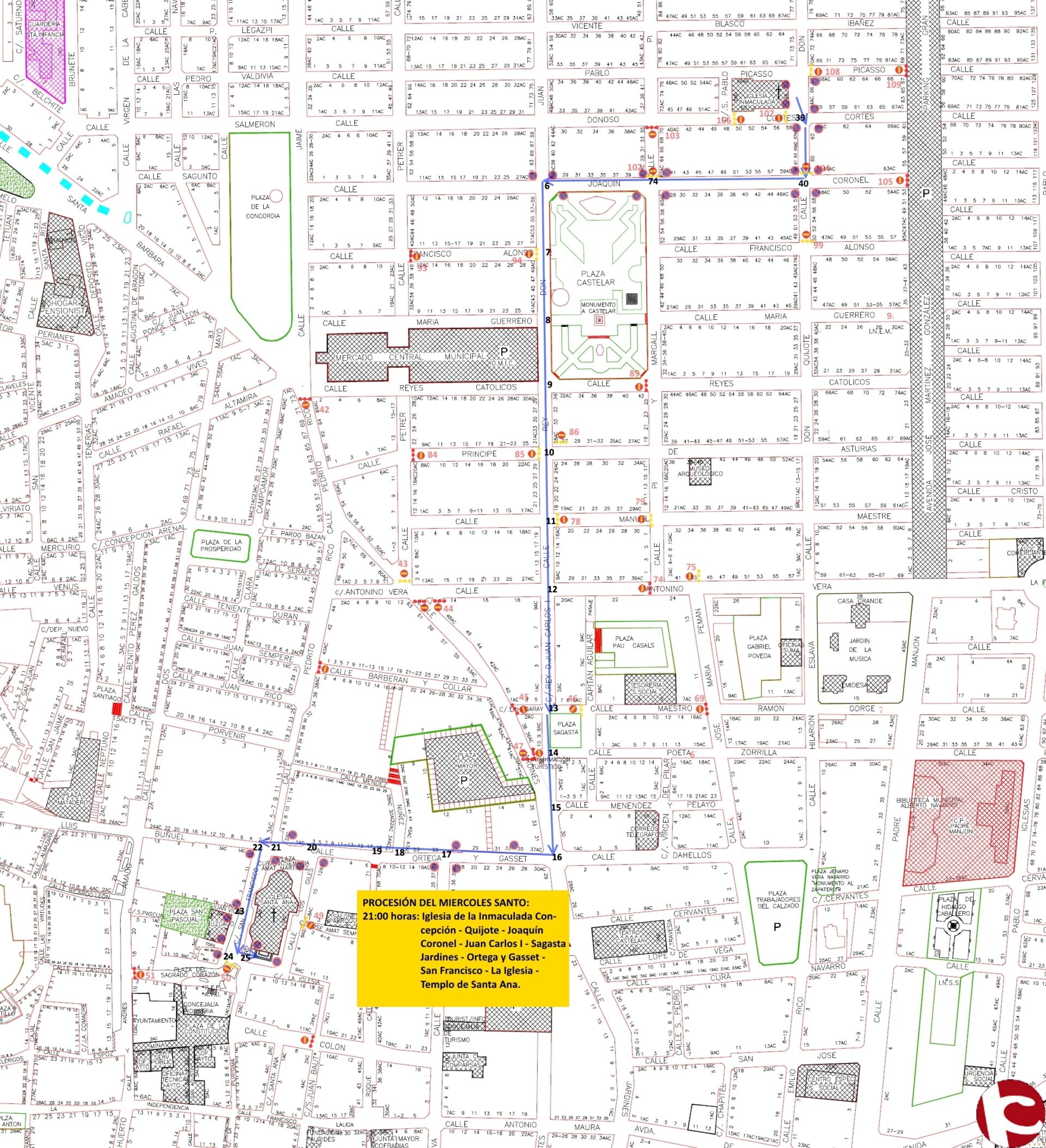 Sirva El presente al objeto de comunicarle el acto que consta (PROCESION DE MIERCOLES SANTO), que tendrá lugar el día 23 de MARZO del presente año, rogando tengan en cuenta el desarrollo del presente en aquellas cuestiones relativas al servicio que desarrollan, informándoles que en el plano constan aquellas calles que, con cuatro horas de antelación al desarrollo del evento, estarán cortadas al tráfico: