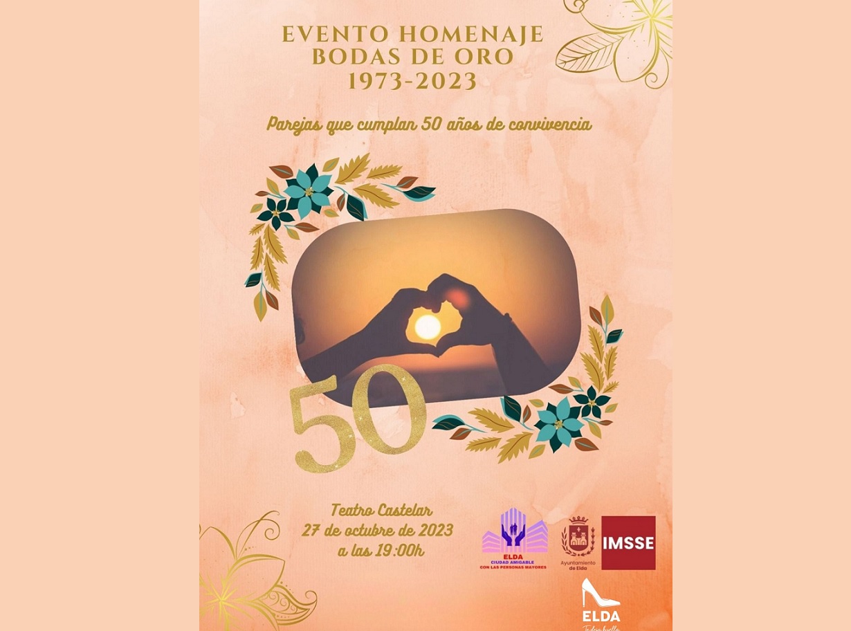 26 de octubre de 2023.- El Ayuntamiento de Elda organiza una nueva edición de las ‘Bodas de Oro’ mañana viernes, 27 de octubre, a las 19.00 horas en el Teatro Castelar con el objetivo de rendir homenaje a los matrimonios eldenses que en 2023 celebran 50 años de casados.
