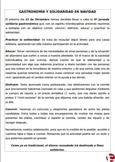 El próximo día 22 de Diciembre se llevará a cabo la 4ª jornada solidaria gastronómica que, con un espíritu interdisciplinar pretende reunirnos a todos/as con un objetivo común: convivir, disfrutar, educar y practicar la solidaridad.