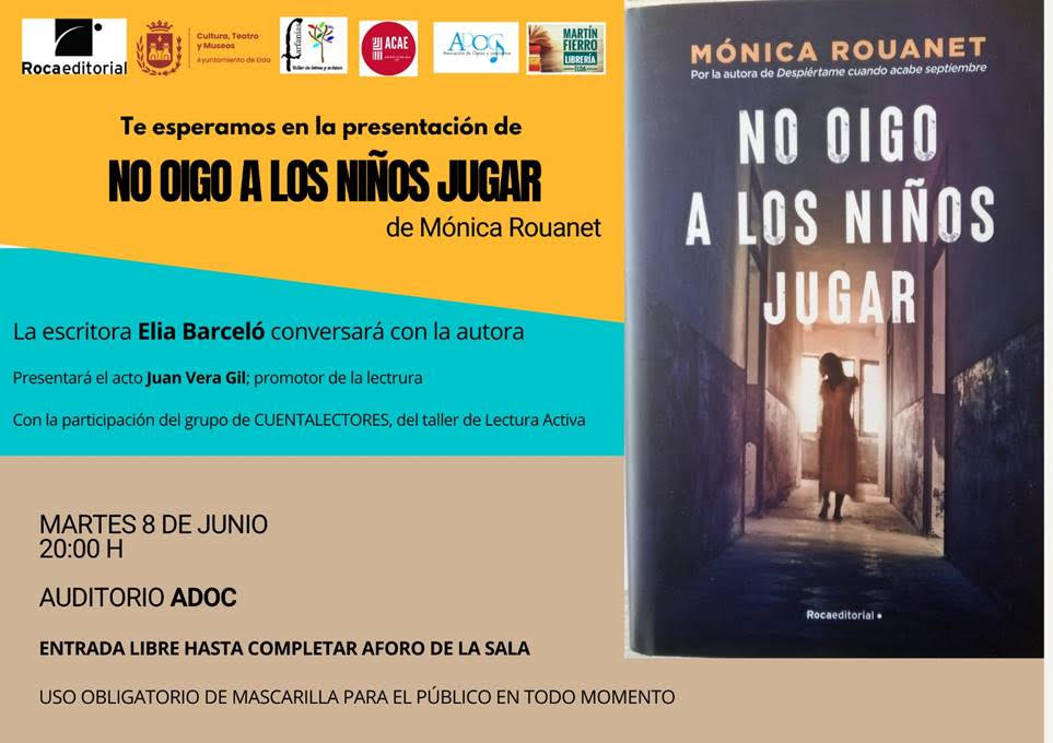 El próximo martes, 8 de junio a las 20 h., en ADOC y con entrada libre hasta completar el aforo, Juan Vera Gil y Elia Barceló, conversarán con la autora Mónica Rouanet, autora de «No oigo a los niños jugar».