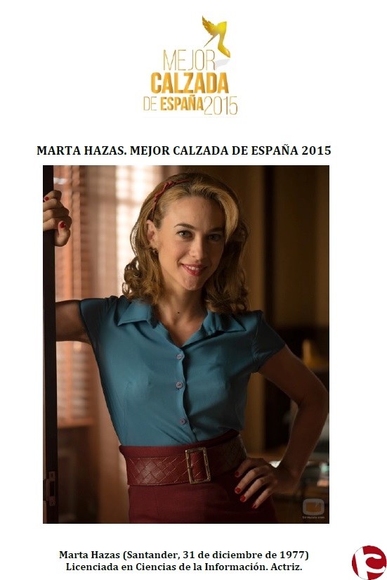 La galardonada con el prestigioso premio de la «Mejor Calzada de España 2015» es la actriz Marta Hazas, así lo ha decidido el jurado de la 15ª edición del certamen. Está previsto que la actriz de 38 años visite Elda el próximo viernes 17 de junio, fecha en la que el Teatro Castelar acogerá la gala de este evento.