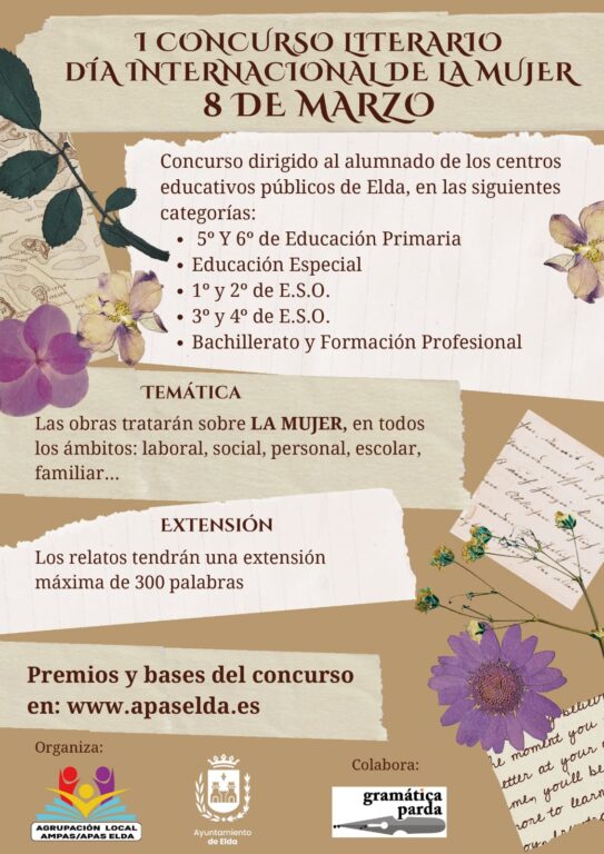 9 de febrero de 2024.– La Agrupación Local de Ampas y el Ayuntamiento de Elda, en colaboración con Gramática Parda, han organizado un concurso literario con motivo del Día Internacional de la Mujer en el que podrá participar el alumnado de los centros educativos de Elda.