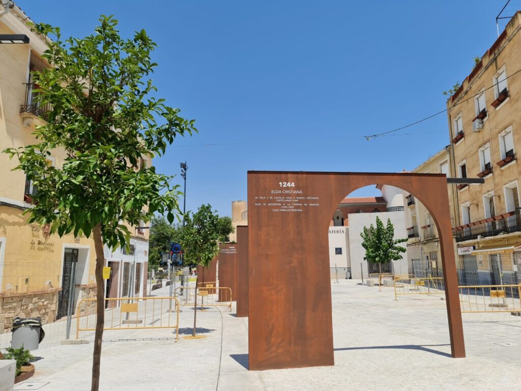 Otro de los atractivos de la nueva Plaza de Arriba es la senda de arcos de acero que sirven para narrar parte de la historia de la ciudad y que conectan el mencionado eje entre el Castillo y la iglesia de Santa Ana, como dos de los epicentros de la vida cotidiana de la Elda de la época.