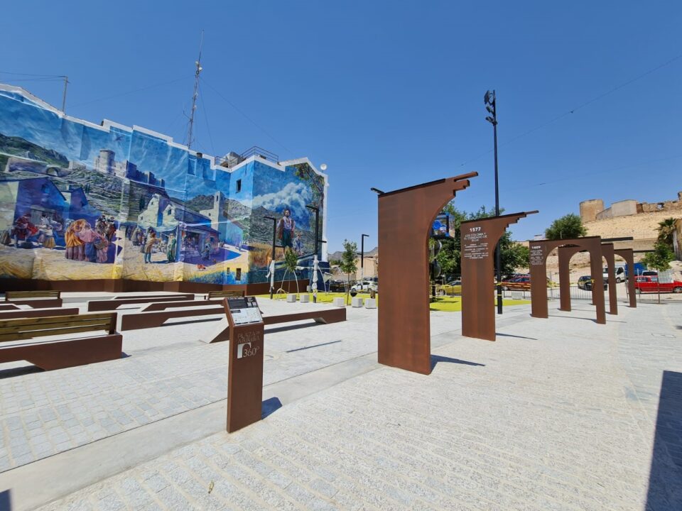 Otro de los atractivos de la nueva Plaza de Arriba es la senda de arcos de acero que sirven para narrar parte de la historia de la ciudad y que conectan el mencionado eje entre el Castillo y la iglesia de Santa Ana, como dos de los epicentros de la vida cotidiana de la Elda de la época.