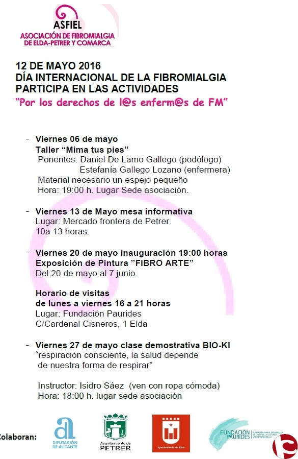 Seguirán el 13 de mayo con una mesa informativa en el Mercado Frontera de Petrer de 11 a 13 horas; el día 20 con la inauguración de la exposición de pintura «Fibro arte», a las 19 horas, que podrán visitar hasta el 7 de junio en la Fundación Paurides, de 16 a 21 horas; y el 27 de mayo clase demostrativa de Bio-Ki, «respiración consciente, la salud depende de nuestra forma de respirar» por el instructor Isidro Sáez, en la sede de la asociación, a las 18 horas, se recomienda llevar ropa cómoda.