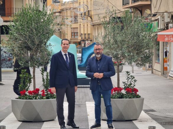 1 de diciembre de 2023.- El alcalde de Elda, Rubén Alfaro, acompañado por el concejal de Espacio Público e Inversiones, José Antonio Amat, ha presentado esta mañana la nueva imagen que a partir de hoy lucirá la calle Juan Carlos I. El regidor eldense ha destacado que «se han instalado nuevas jardineras y maceteros y, como elementos más llamativos y destacado, también hemos instalado diez zapatos gigantes, decorados con colores vivos para llamar la atención».