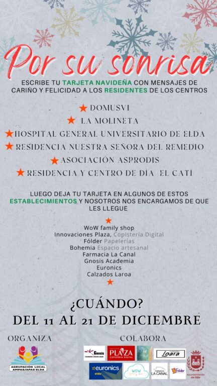 La campaña ‘Por su sonrisa’ volverá a repartir por cuarto año felicitaciones navideñas entre las personas que se encuentran ingresadas en centros de mayores y de dependientes de Elda