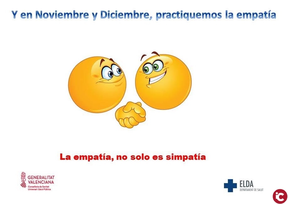 En el proceso de humanizar los cuidados iniciados en el Departamento de Salud de Elda durante los meses de noviembre y diciembre de 2019,vamos a ser más empáticos que de costumbre, porque la empatía, no solo es simpatía. Pongámonos en el lugar del otro y caminemos juntos. Mirémonos a los ojos y regalemos una sonrisa.