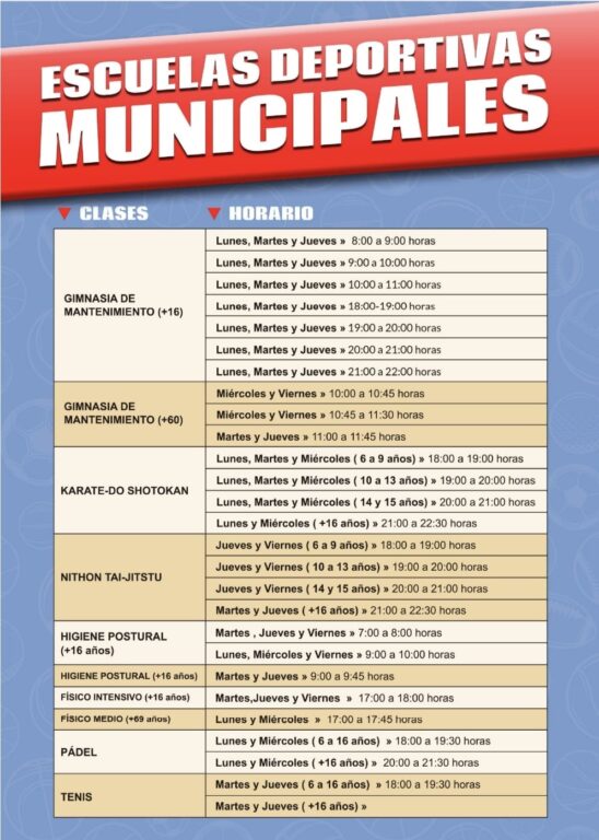 Hay que recordar que las Escuelas Deportivas Municipales de Elda suman más de 500 plazas entre las diferentes modalidades existentes: Gimnasia de Mantenimiento (para mayores de 16 años y para mayores de 60), Karate, Tai-Jitsu, Higiene Postural, Físico Intensivo (mayores de 16 años), Físico Medio (mayores de 60 años), Tenis y Pádel.