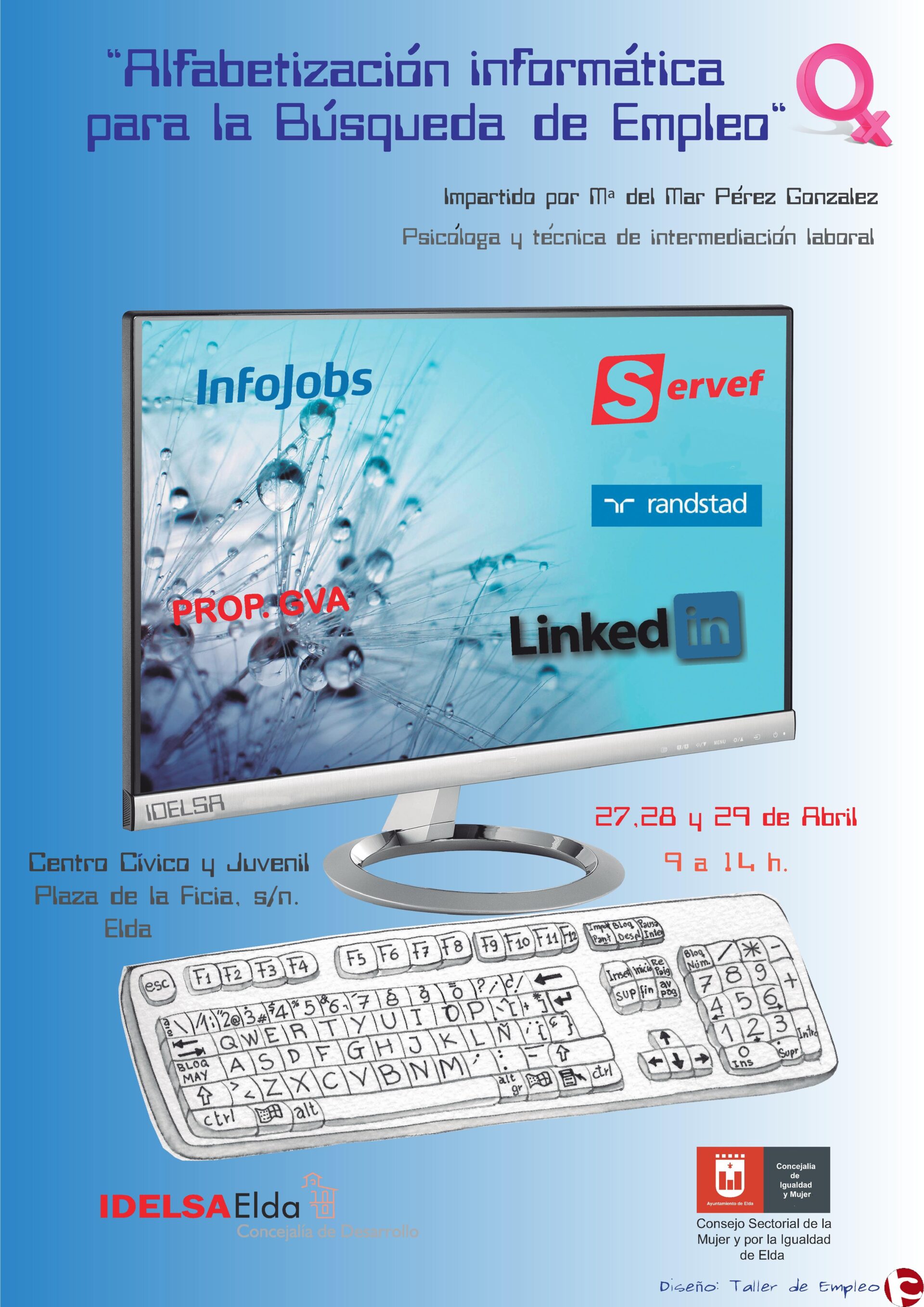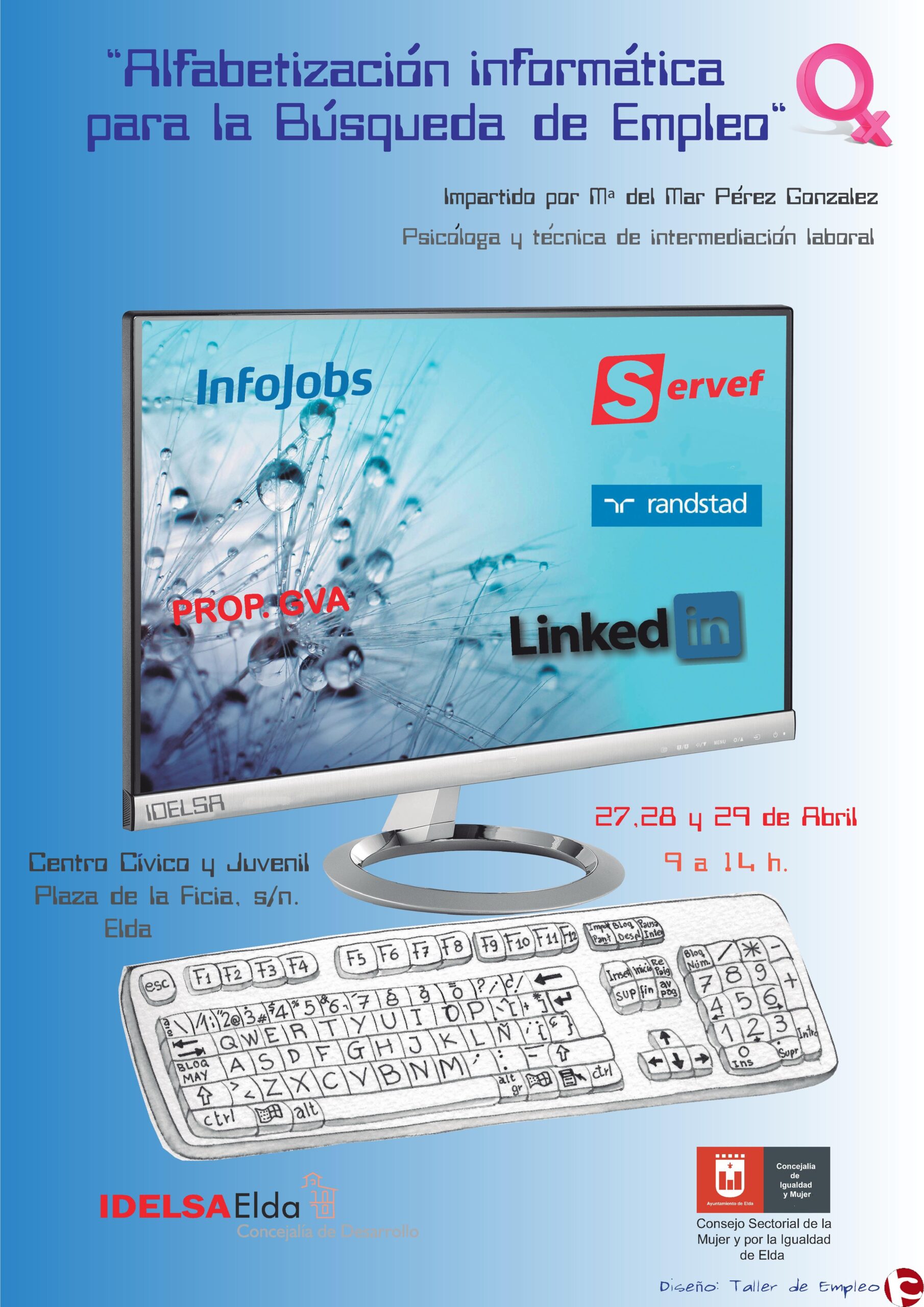 El segundo Taller Alfabetización Informática para la Búsqueda de Empleo será impartido por Mª del Mar Pérez González, psicóloga y técnica de intermediación laboral. Se desarrollará los días 27, 28 y 29 de abril, de 9 a 14 horas en el Centro Cívico y Juvenil.