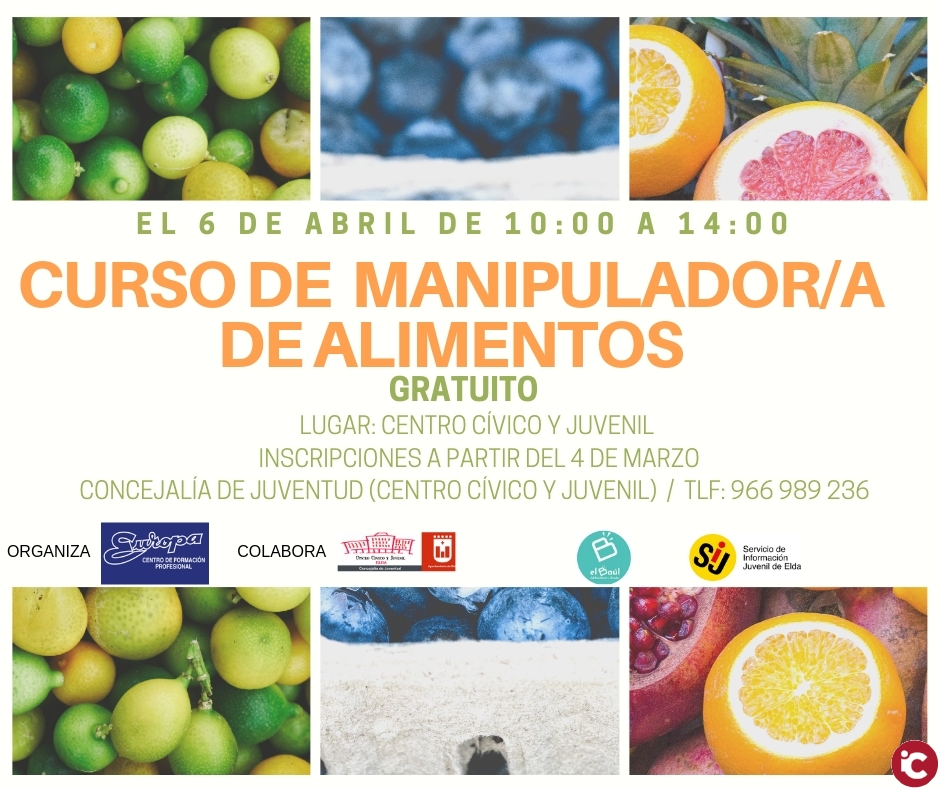 En ese sentido, el Centro Cívico y Juvenil de Elda acogerá el próximo 6 de abril, de 10 a 14 horas, un curso de Manipulador de Alimentos organizado por el Centro de Formación Profesional Europa de Elche, en colaboración con la propia Concejalía de Juventud.