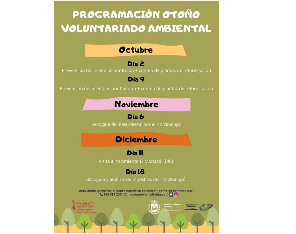 “Las actividades son totalmente gratuitas y cualquier ciudadano y ciudadana puede apuntarse”, ha añadido la edil. Las personas interesadas pueden contactar con la Concejalía de Medio Ambiente llamando al 966 989 207, por correo electrónico (medioambiente@elda.es) o directamente a través de la página web municipal (http://www.elda.es/medio-ambiente/voluntariado-ambiental/) donde se puede descargar el formulario para remitirlo a la Concejalía.
