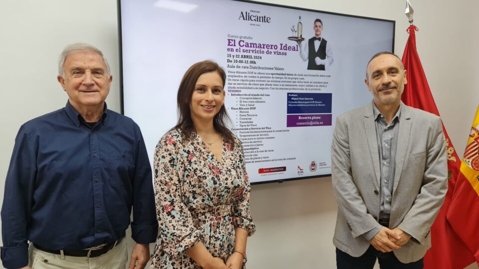 8 de abril de 2024.– La DOP Vinos de Alicante y el Ayuntamiento de Elda ofrecen un curso gratuito destinado a mejorar la formación de camareros y jefes de sala de restaurantes de la ciudad. La concejala de Comercio y Mercados, Silvia Ibañez, acompañada de Francis Valero, de Distribuciones Valero y representante de la DOP, ha dado a conocer los detalles de un curso que será impartido por el formador y sumiller, Miguel Garri, que también ha estado presente en la rueda de prensa.