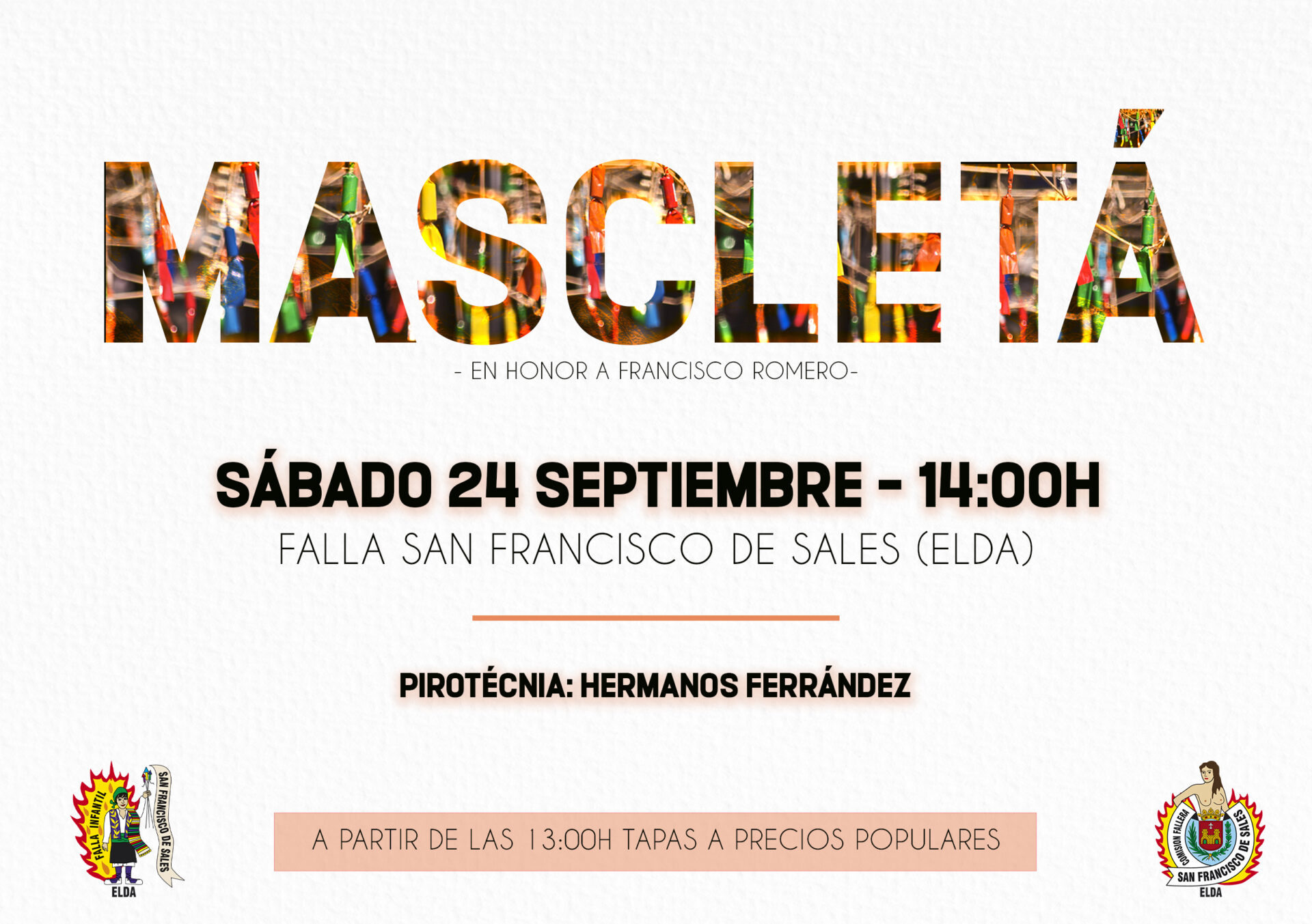 Desde la Falla San Francisco de Sales nos informan que por primera vez, se va a realizar una mascletá en un barrio fallero. Será un acto excepcional en las Fallas de Elda.