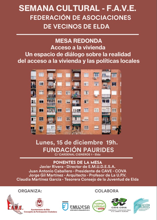 • Lunes 15 de diciembre: Mesa redonda “Acceso a la vivienda. Un espacio de diálogo sobre la realidad del acceso a la vivienda y las políticas locales”.