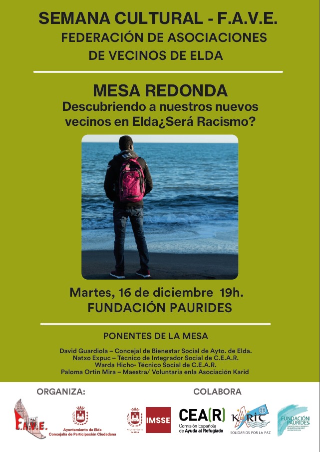 • Martes 16 de diciembre: Mesa redonda “Descubriendo a nuestros nuevos vecinos en Elda. ¿Será racismo?”.
