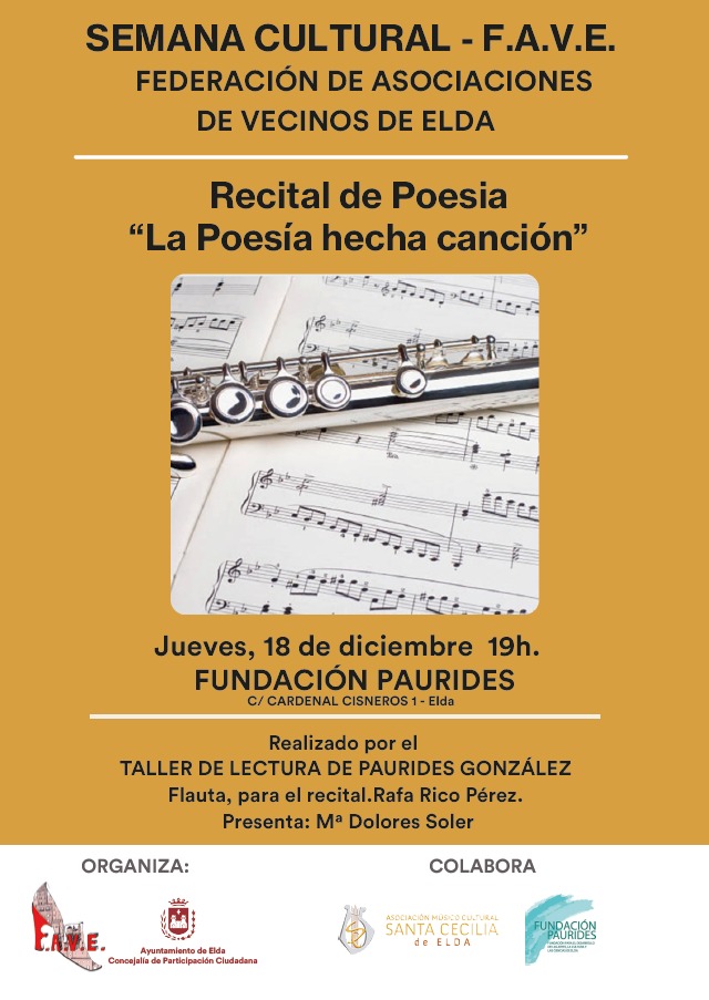 • Jueves 18 de diciembre: Recital de poesía en colaboración con el Taller de Lectura Paurides “La poesía hecha canción”.