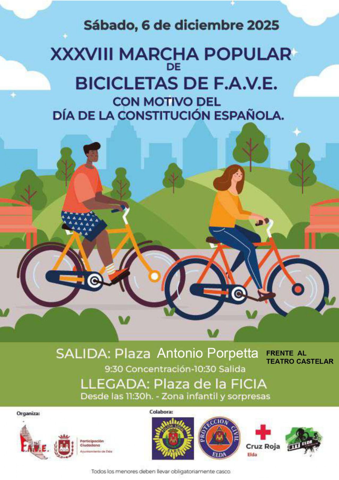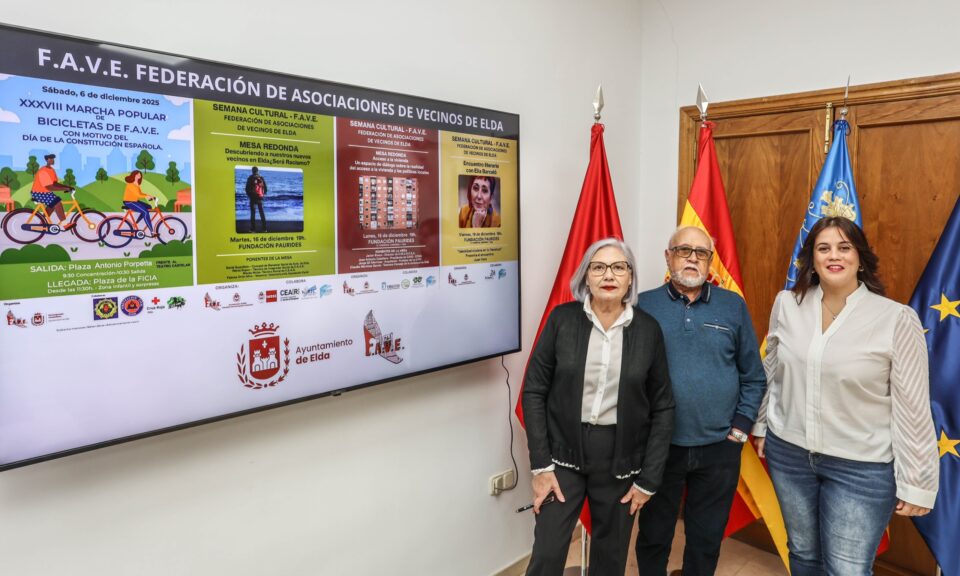El Ayuntamiento de Elda, a través de la Concejalía de Participación Ciudadana, y la Federación de Asociaciones de Vecinos de Elda (FAVE) organizan un año más la tradicional Marcha Popular de Bicicletas con motivo del Día de la Constitución, que este año alcanzará su 38 edición. La concejala de Participación Ciudadana, Lorena Pedrero, la presidenta de la FAVE, María Salud Corbí, y el vocal de la federación, Pepe Busquier, han presentado esta mañana los detalles de la actividad.