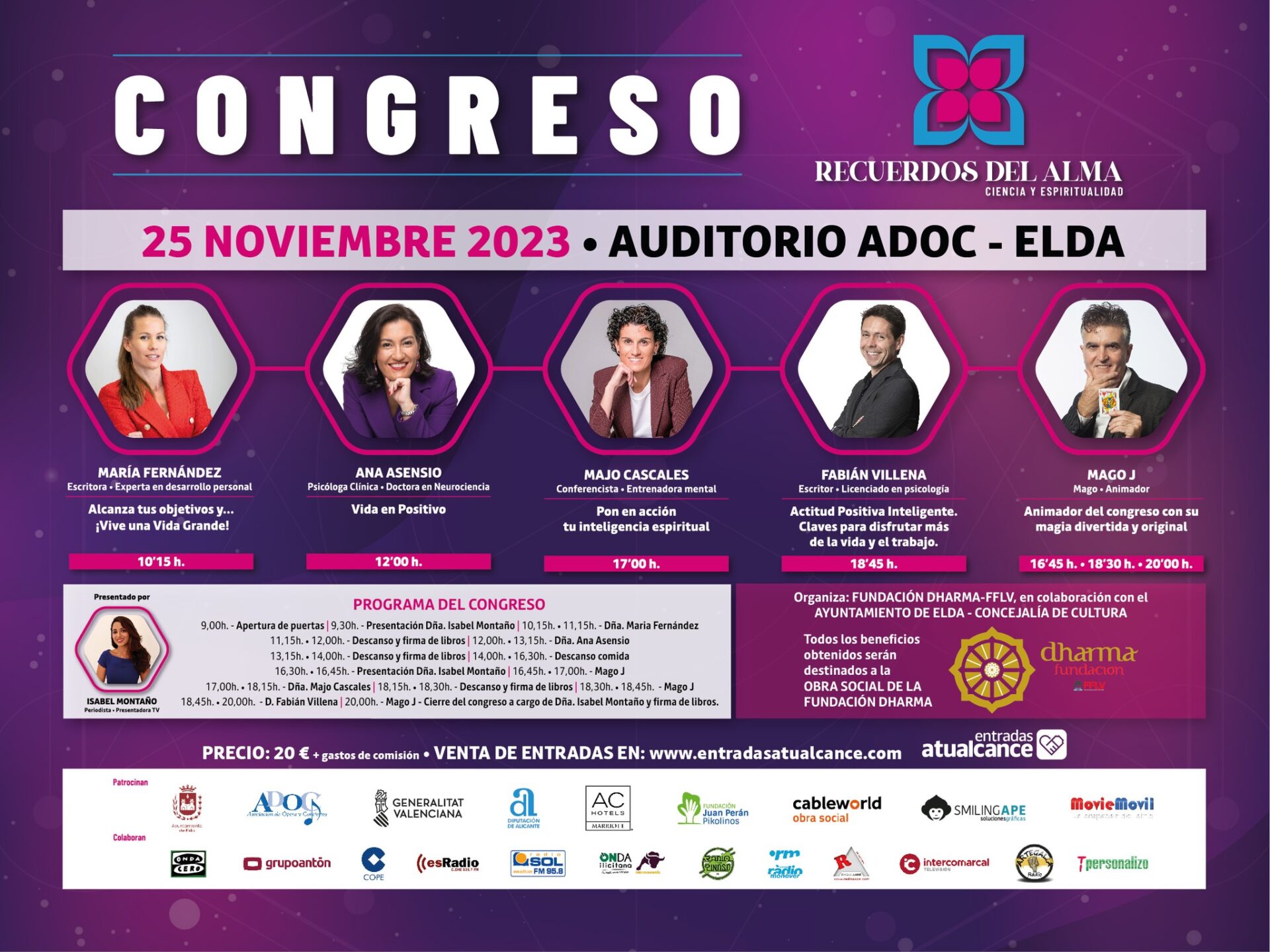 Este encuentro solidario sobre crecimiento personal, motivación, superación y conciencia, se realiza a beneficio de su Obra Social en la India. El congreso estará presentado por la periodista Isabel Montaño y contará con la presencia de ponentes internacionales como Ana Asensio cuya ponencia se titulará «Vida en positivo». Además, el encuentro contará con la presencia de la escritora y experta en desarrollo personal, María Fernández, cuya ponencia se titulará «Alcanza tus objetivos, y ¡Vive una vida Grande!»; con el licenciado en psicología Fabián Villena cuya ponencia versará sobre la “Actitud Positiva Inteligente. Claves para disfrutar más de la vida y el trabajo”; y con la ponencia de la entrenadora mental Majo Cascales, cuyo título de su ponencia es «Pon acción en tu inteligencia espiritual».