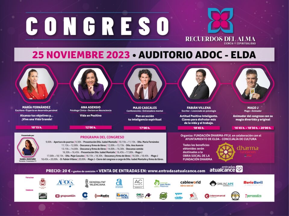 La Fundación Dharma de Elda ha organizado un año más el Congreso «Recuerdos del Alma» sobre ciencia y espiritualidad. El encuentro tendrá lugar el próximo sábado 25 de noviembre en el auditorio ADOC de la localidad y la entrada tendrá un coste de 20 euros más gastos de gestión.