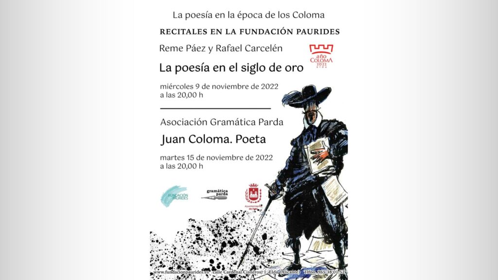 La primera de estas actividades tendrá lugar el miércoles 9 de noviembre, a las 20.00 horas, en la Fundación Paurides y tendrá como protagonista a la poesía del Siglo de Oro. El recital correrá a cargo de Reme Páez y Rafael Carcelén. La segunda propuesta se celebrará el 15 de noviembre, también a las 20.00 horas en la Fundación Paurides, y correrá a cargo de la Asociación Gramática Parda para abordar la figura de Juan Coloma como poeta.