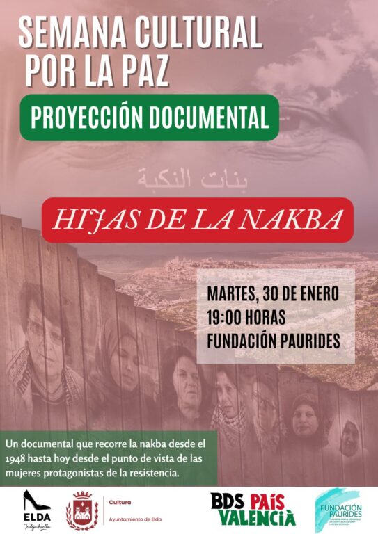 25 de enero de 2024.- La Concejalía de Cultura del Ayuntamiento de Elda, dentro de la programación organizada dentro de la Semana Cultural por la Paz, ofrecerá el próximo martes a las 19.00 horas en la Fundación Paurides la proyección del documental de la directora Estela Falastín ‘Hijas de la Nakba’, coincidiendo con el Día Internacional de la Paz y la No Violencia.