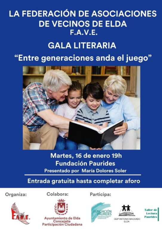 12 de enero de 2024.- La Fundación Paurides acogerá el próximo martes una nueva edición de la Gala Literaria organizada por la Federación de Asociaciones de Vecinos de Elda (FAVE), una actividad que cumple su cuarta edición y que en esta ocasión llevará como título ‘Entre generaciones anda el juego’.