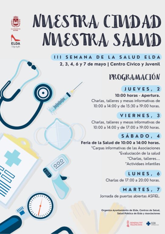 El Centro Cívico y Juvenil y el Museo del Calzado acogerán los días 2, 3, 4, 6 y 7 de mayo la tercera edición de la Semana de la Salud, organizada por el Ayuntamiento de Elda, a través de la Concejalía de Salud y Participación Ciudadana, en colaboración con el Departamento de Salud de Elda y asociaciones y colectivos de la ciudad relacionados con la salud.